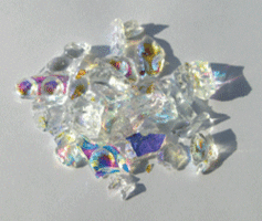 Glass med et metallisk belegg som reflekterer ulike farger avhengig av hvilken vinkel man ser glasset fra. Spennende til bruk ved laging av fat,bilder,smykker o.l.